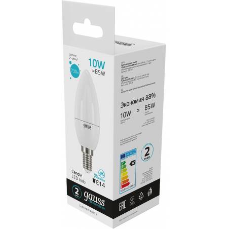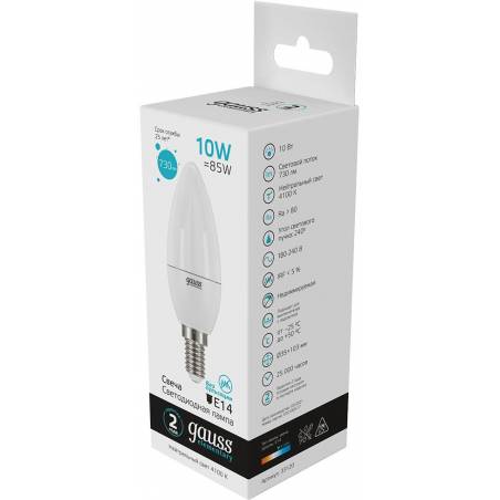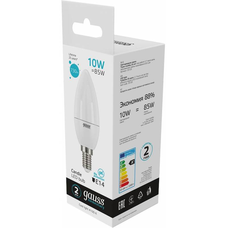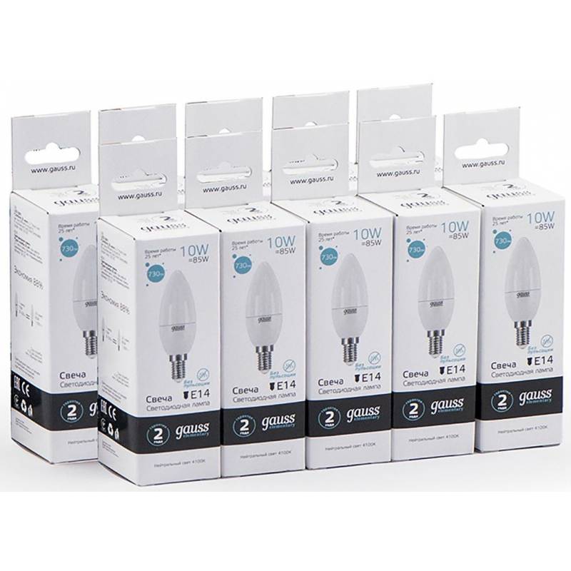 Лампа светодиодная Gauss Elementary 10Вт цок.:E14 свеча 220B 4100K св.свеч.бел.нейт. C37 (упак.:10шт) (33120)