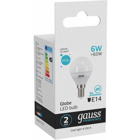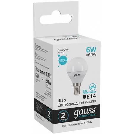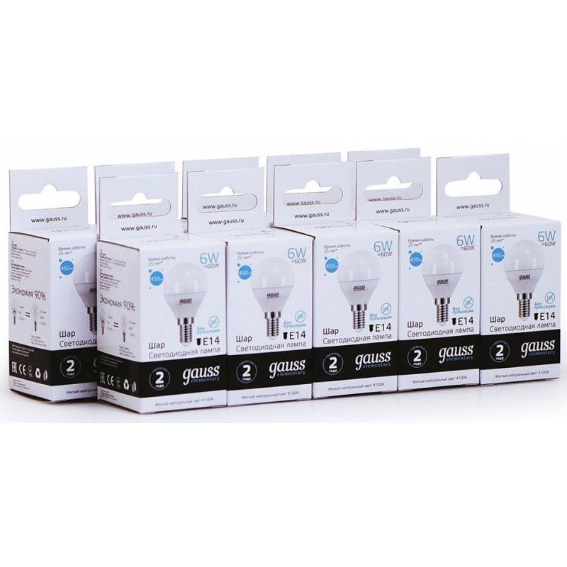 Лампа светодиодная Gauss Elementary 6Вт цок.:E14 шар 220B 4100K св.свеч.бел.нейт. (упак.:10шт) (53126)