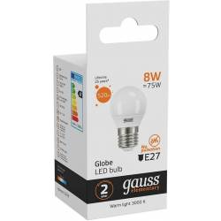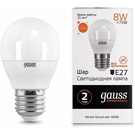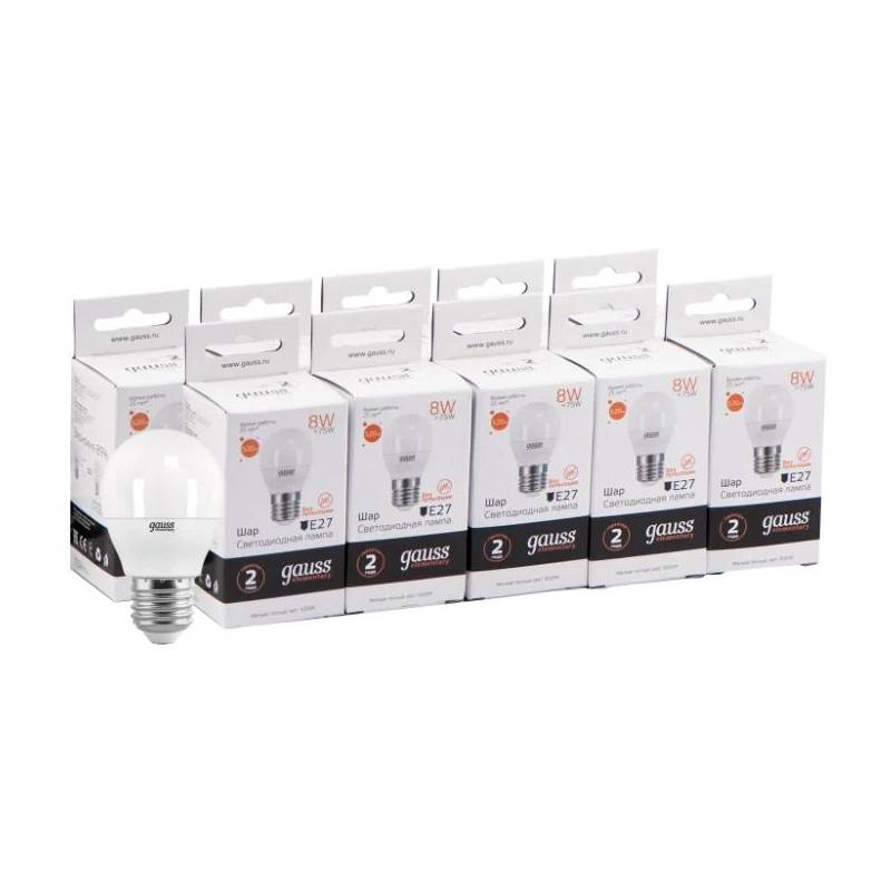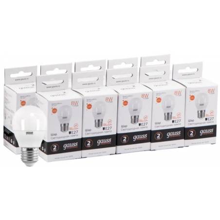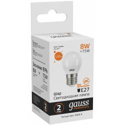 Лампа светодиодная Gauss Elementary 8Вт цок.:E27 шар 220B 3000K св.свеч.бел.теп. (упак.:10шт) (53218)