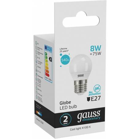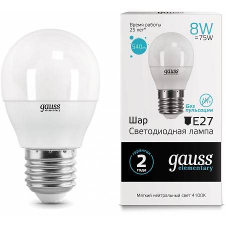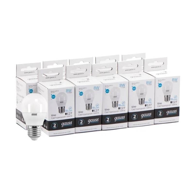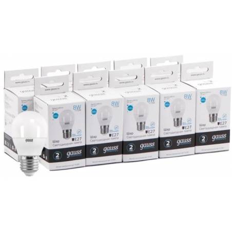Лампа светодиодная Gauss Elementary 8Вт цок.:E27 шар 220B 4100K св.свеч.бел.нейт. (упак.:10шт) (53228)