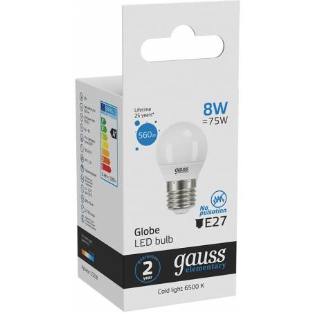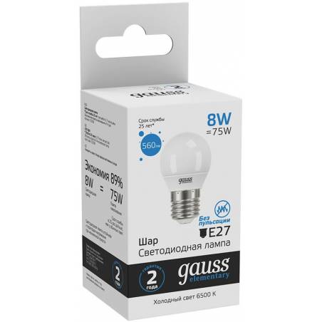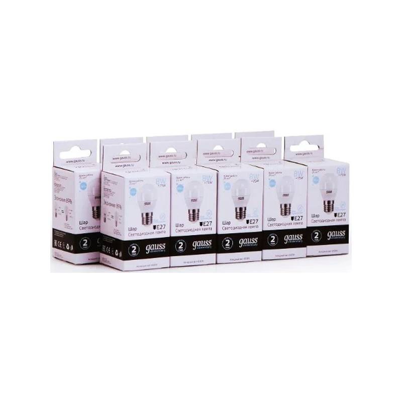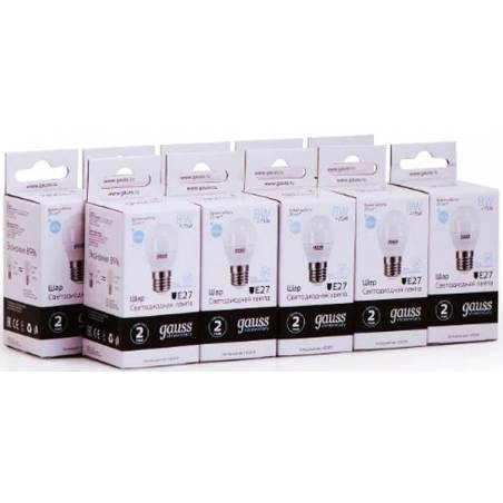 Лампа светодиодная Gauss Elementary 8Вт цок.:E27 шар 220B 6500K св.свеч.бел.хол. (упак.:10шт) (53238)