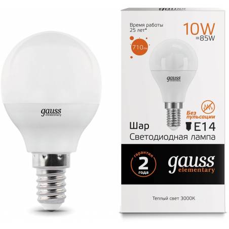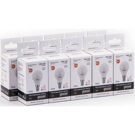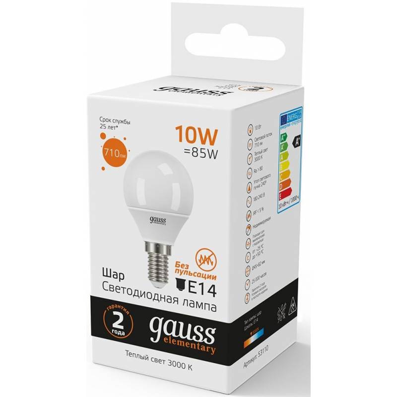 Лампа светодиодная Gauss Elementary 10Вт цок.:E14 шар 220B 3000K св.свеч.бел.теп. (упак.:10шт) (53110)
