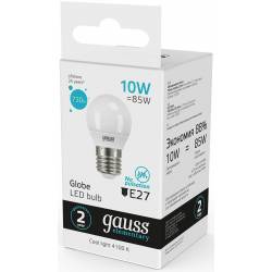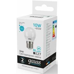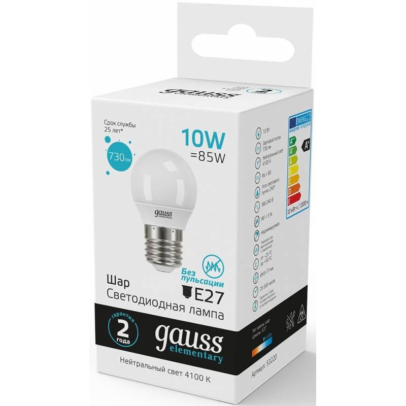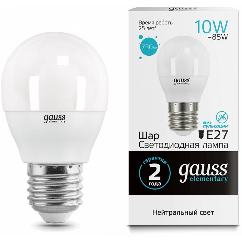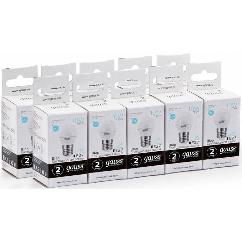 Лампа светодиодная Gauss Elementary 10Вт цок.:E27 шар 220B 4100K св.свеч.бел.нейт. (упак.:10шт) (53220)