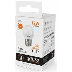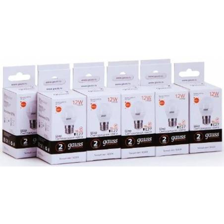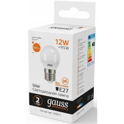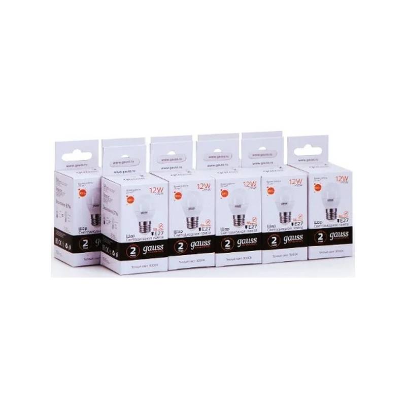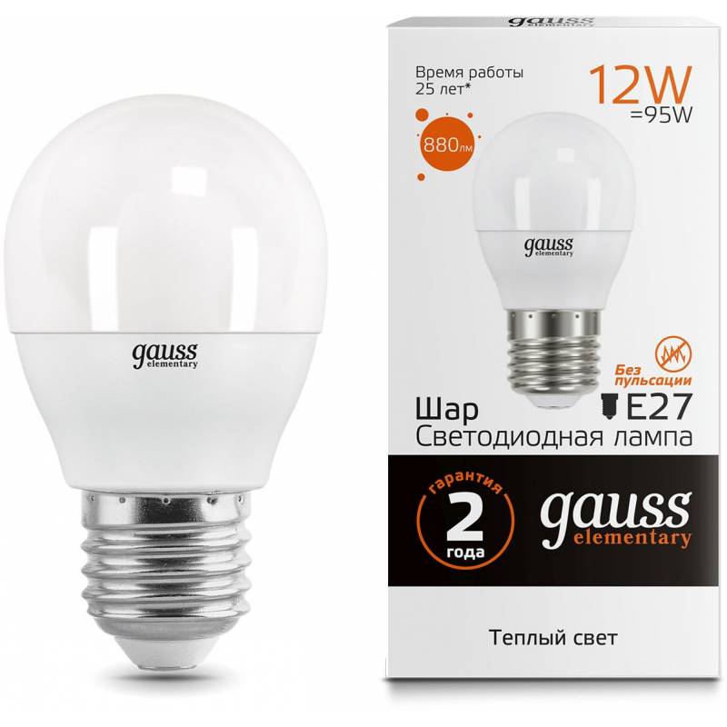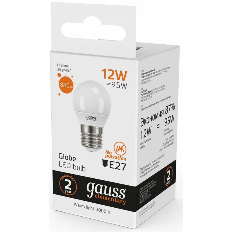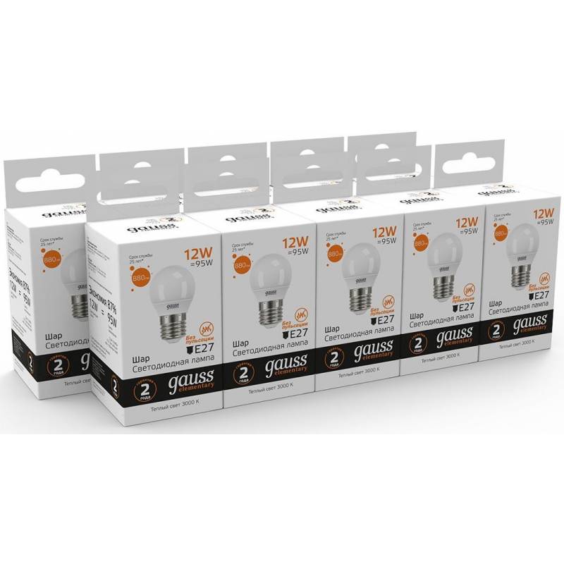 Лампа светодиодная Gauss Elementary 12Вт цок.:E27 шар 220B 3000K св.свеч.бел.теп. (упак.:10шт) (53212)