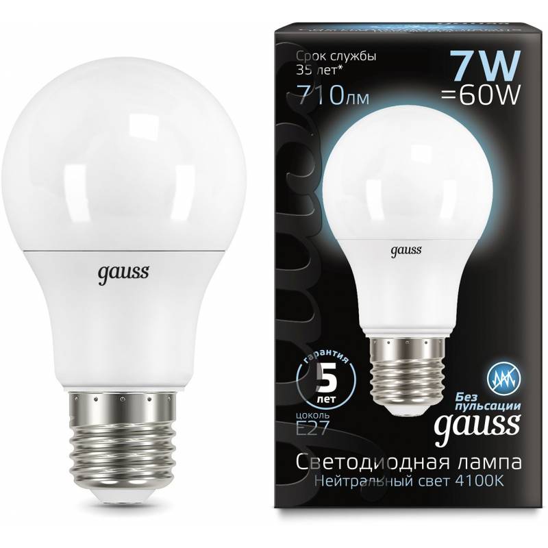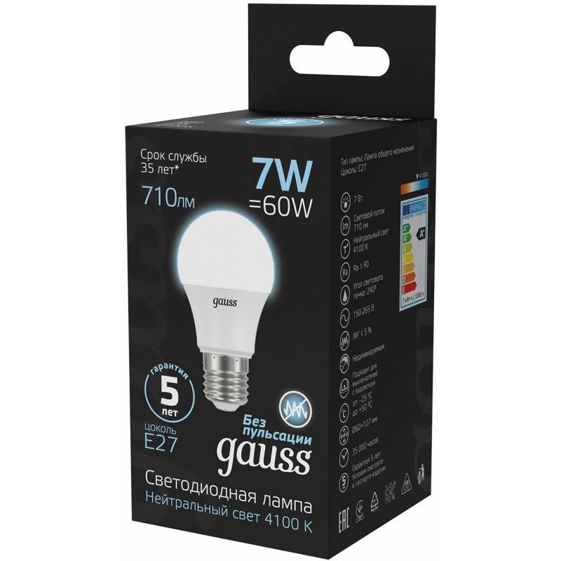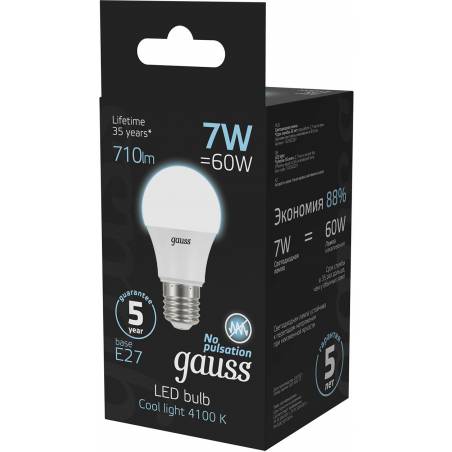 Лампа светодиодная Gauss 7Вт цок.:E27 шар 220B 4100K св.свеч.бел.нейт. A60 (упак.:10шт) (102502207)