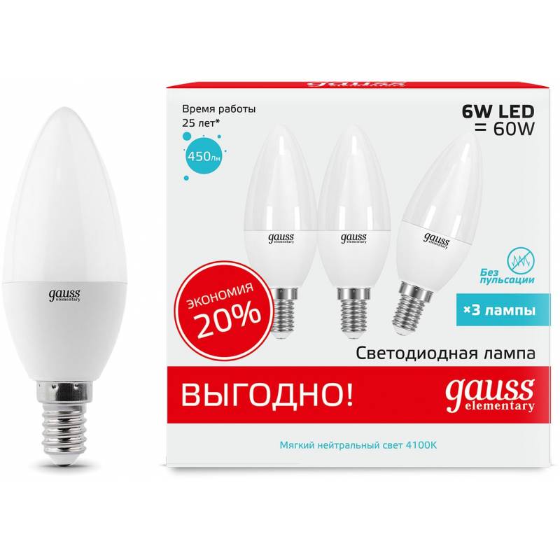 Лампа светодиодная Gauss Elementary 33126T 6Вт цок.:E14 свеча 180B 4100K св.свеч.бел.нейт. (упак.:3шт)