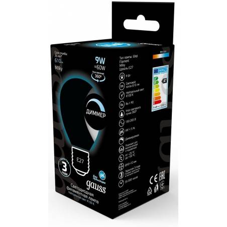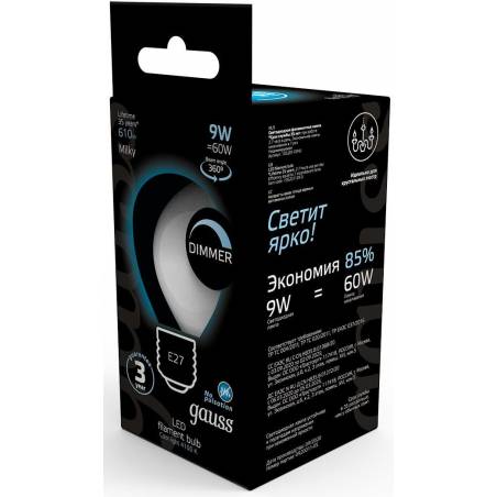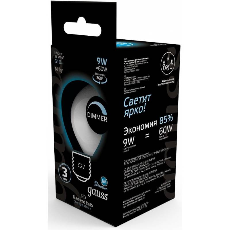 Лампа светодиодная Gauss Filament 105202209-D 9Вт цок.:E27 шар 220B 4100K св.свеч.бел.нейт. (упак.:10шт)