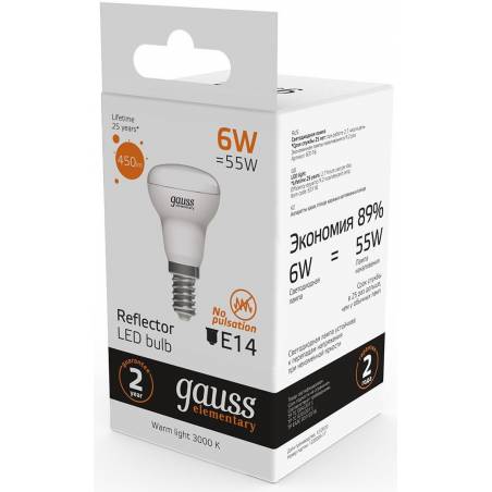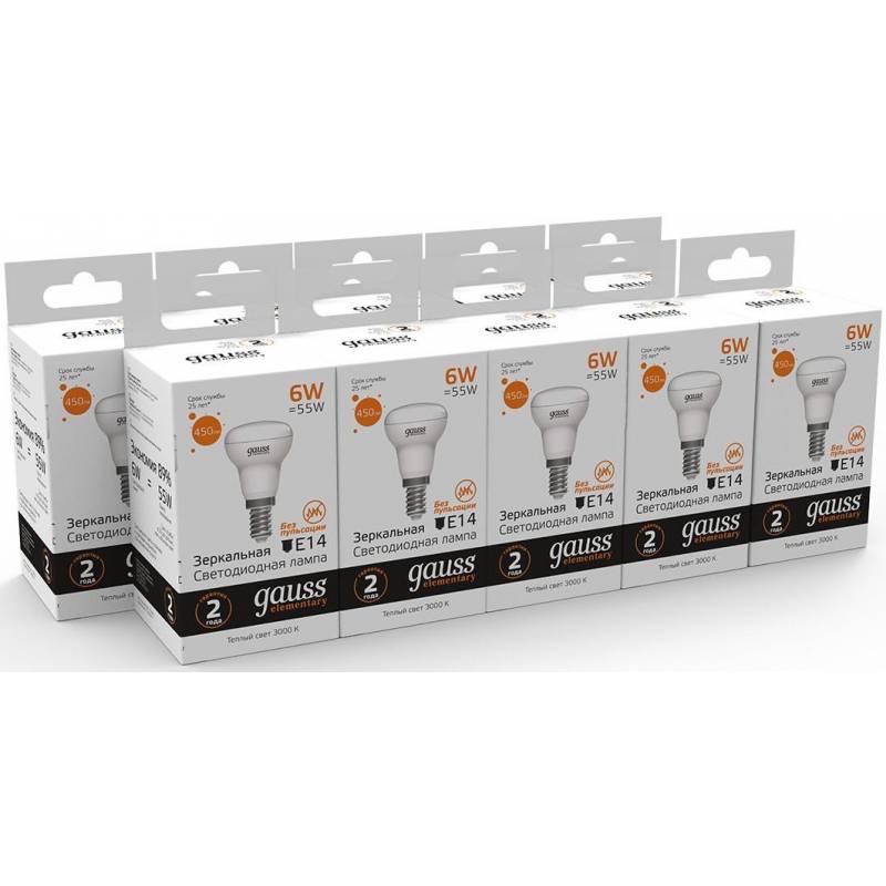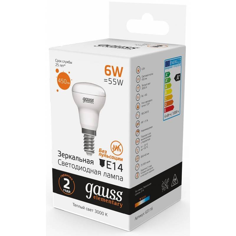 Лампа светодиодная Gauss Elementary 63116 6Вт цок.:E14 рефлек. 220B 3000K св.свеч.бел.теп. (упак.:10шт)