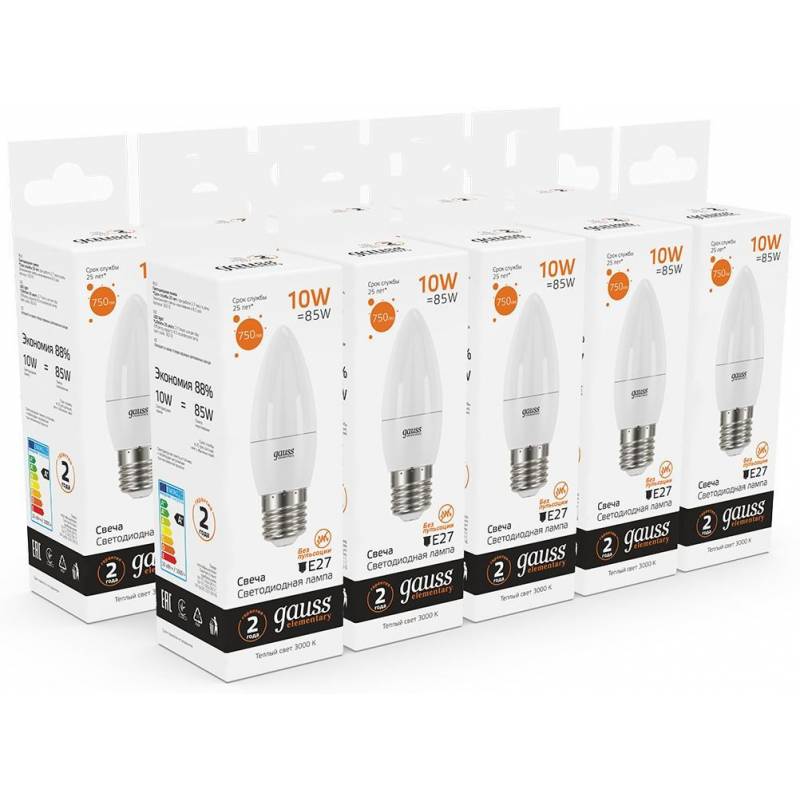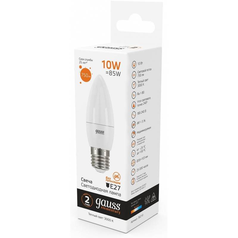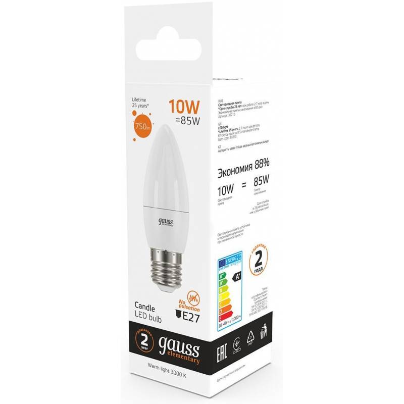 Лампа светодиодная Gauss Elementary 30210 10Вт цок.:E27 свеча 220B 3000K св.свеч.бел.теп. (упак.:10шт)