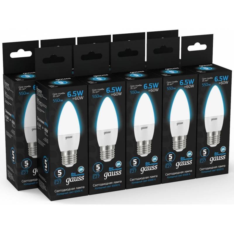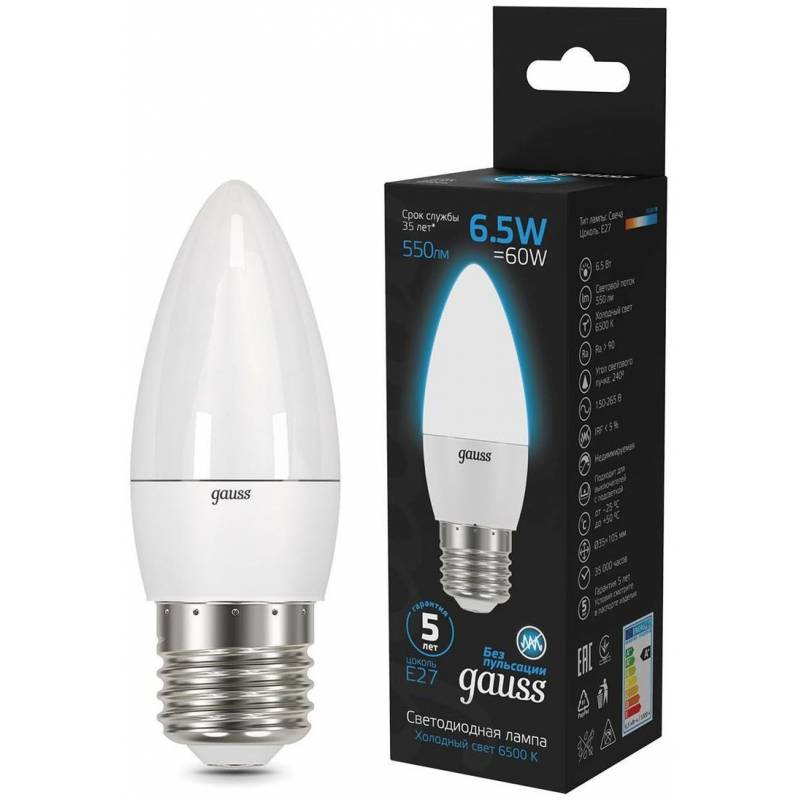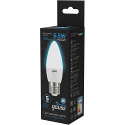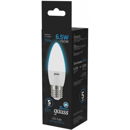 Лампа светодиодная Gauss 103102307 6.5Вт цок.:E27 свеча 220B 6500K св.свеч.бел.хол. (упак.:10шт)
