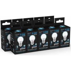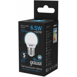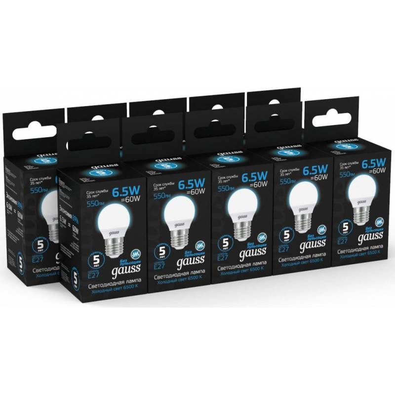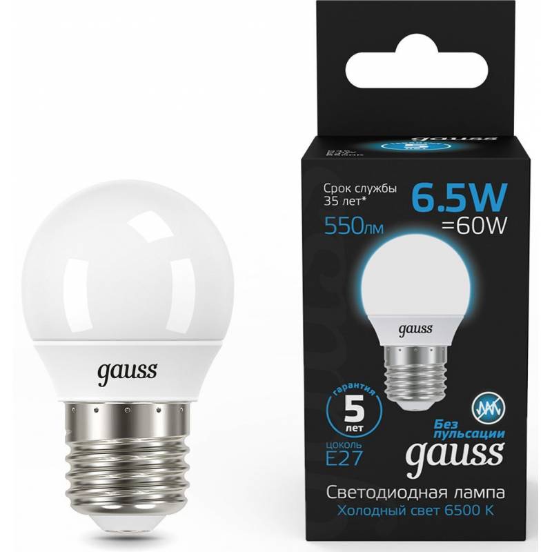 Лампа светодиодная Gauss 105102307 6.5Вт цок.:E27 шар 220B 6500K св.свеч.бел.хол. (упак.:10шт)