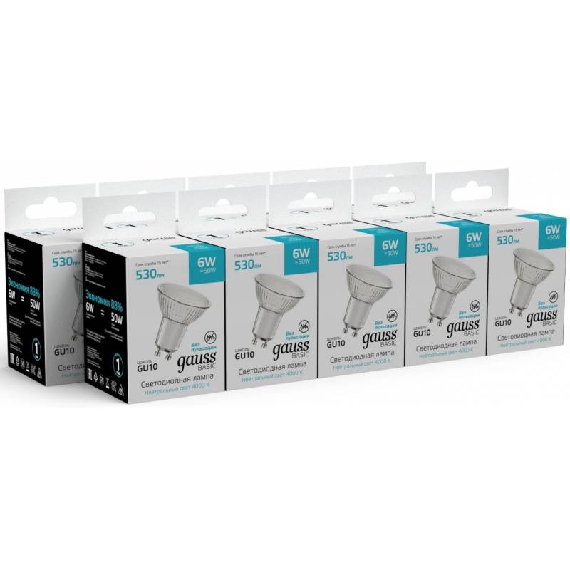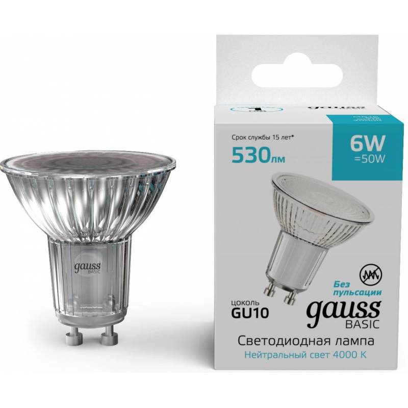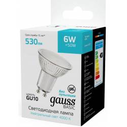 Лампа светодиодная Gauss Basic 10106262 6Вт цок.:GU10 софит 220B св.свеч.бел.нейт. (упак.:1шт)