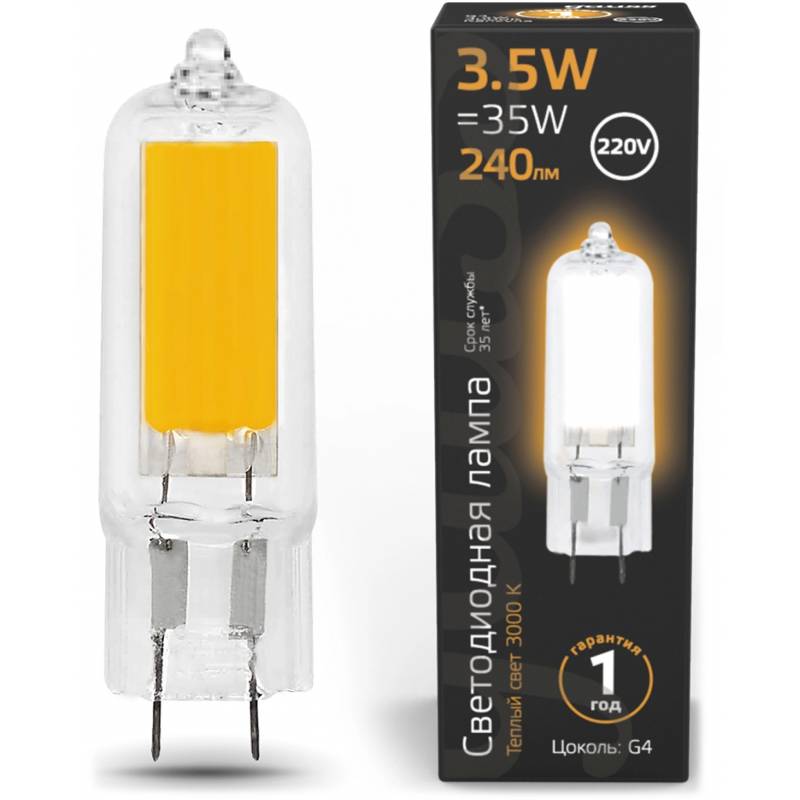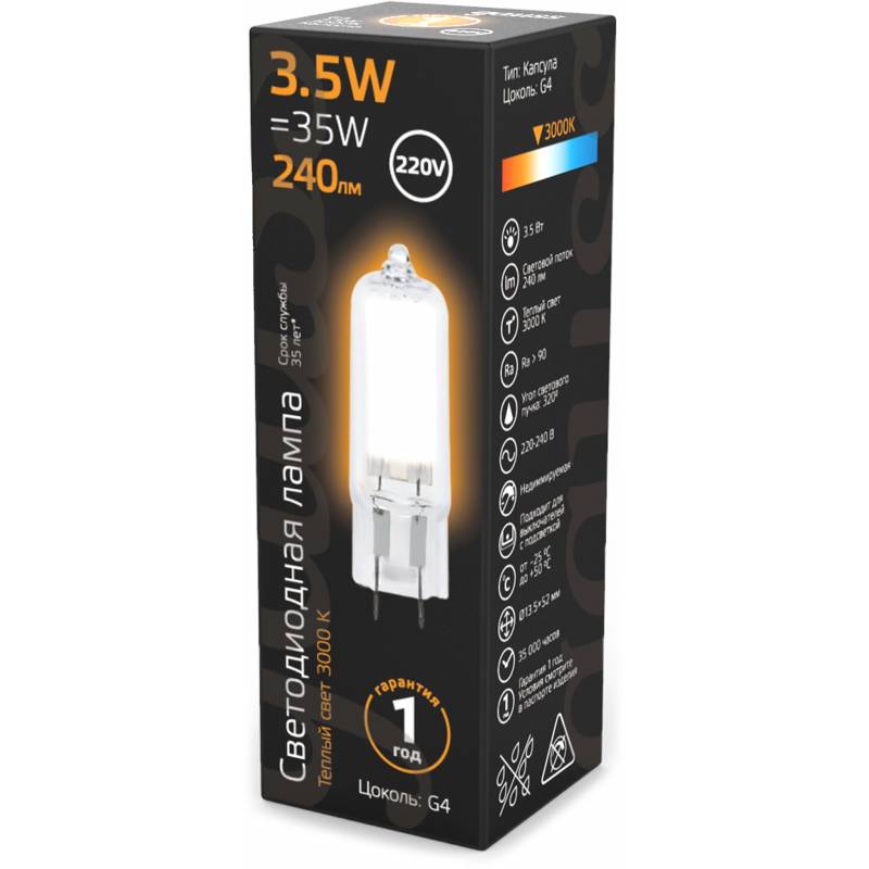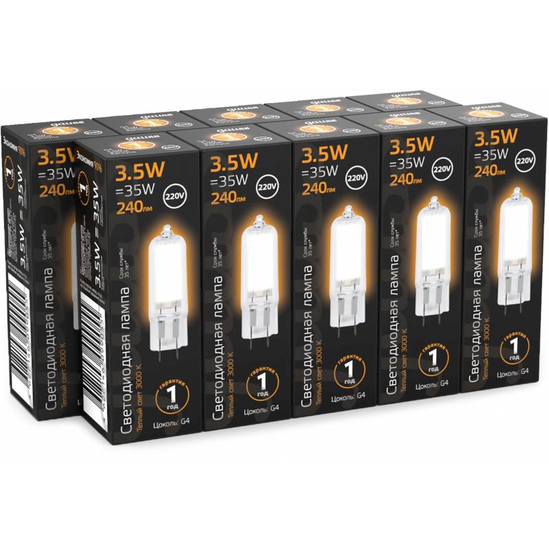Лампа светодиодная Gauss G4 3.5Вт цок.:G4 капсул. 220B св.свеч.бел.теп. (упак.:10шт) (107807103)