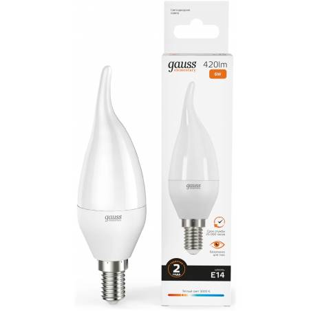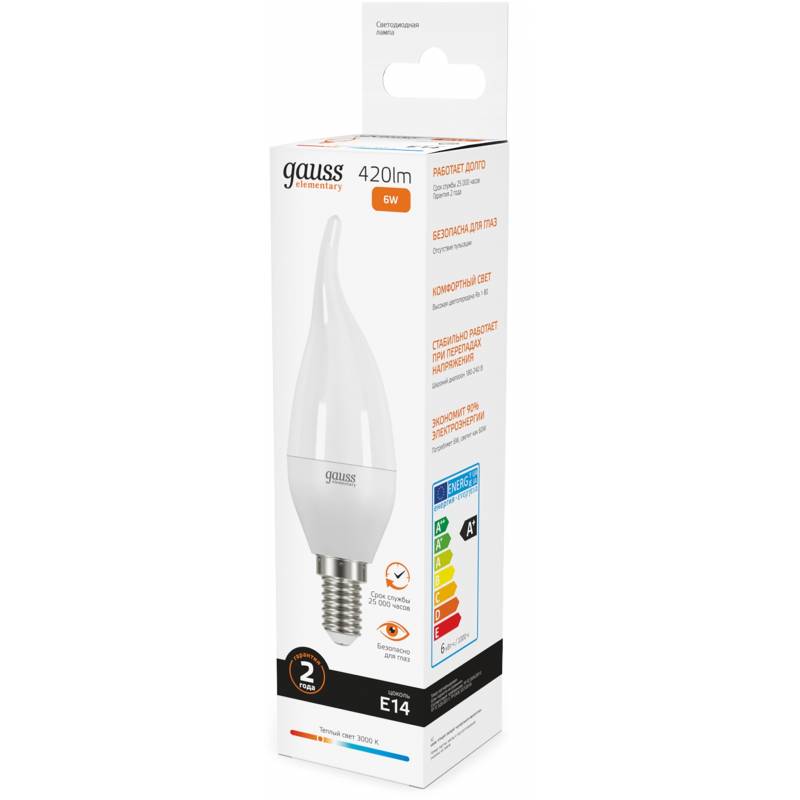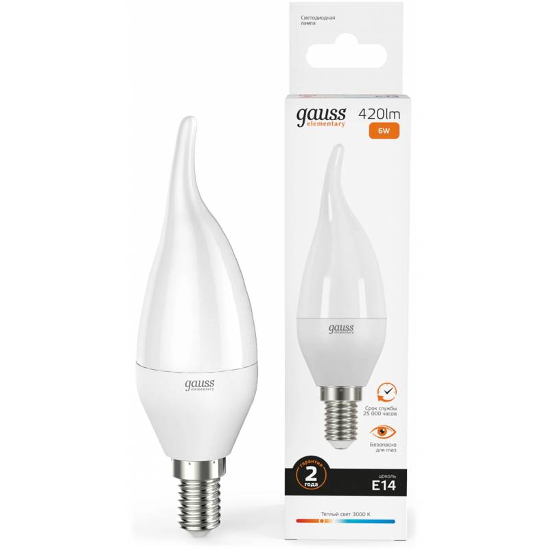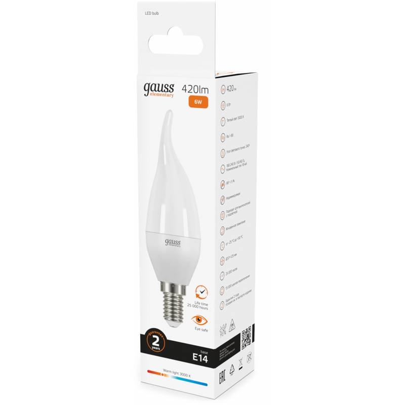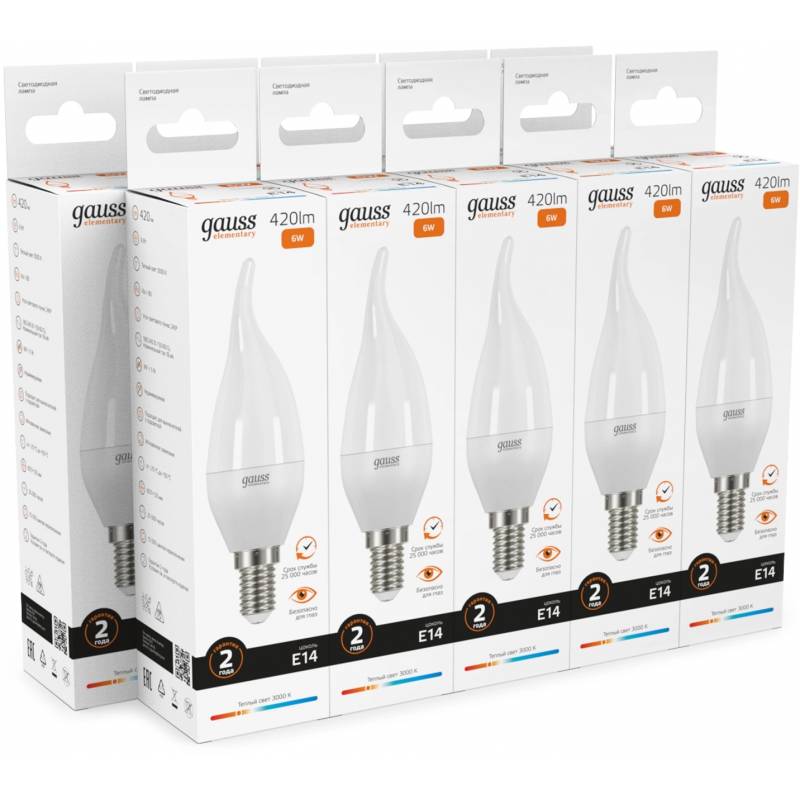 Лампа светодиодная Gauss Elementary 6Вт цок.:E14 свеча 220B св.свеч.бел.теп. (упак.:10шт) (34116)