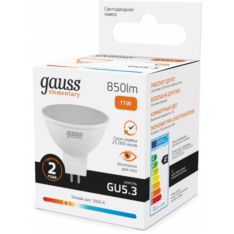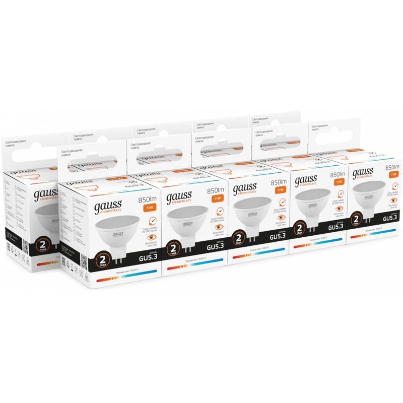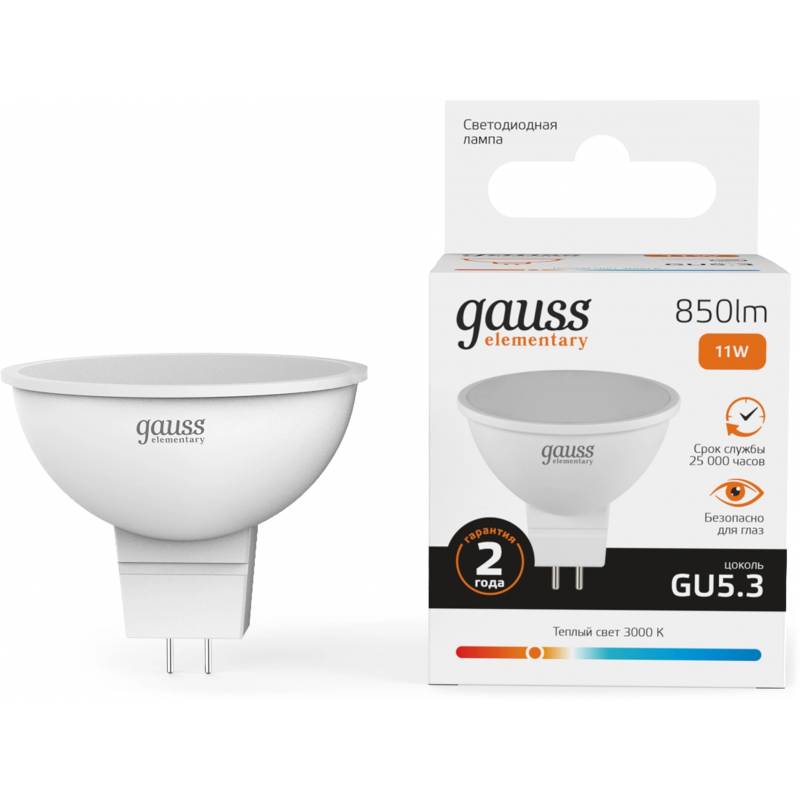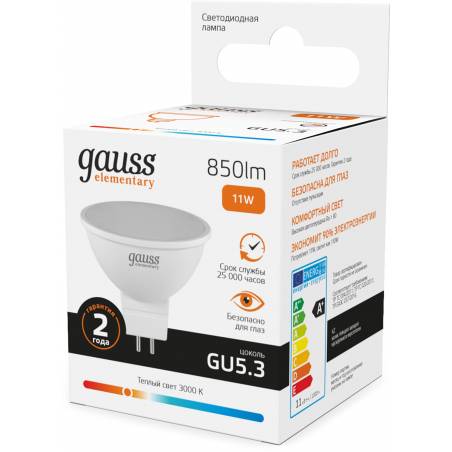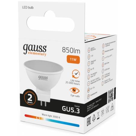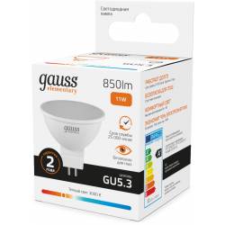 Лампа светодиодная Gauss Elementary 13511 11Вт цок.:GU5.3 софит 220B св.свеч.бел.теп. MR16 (упак.:10шт)