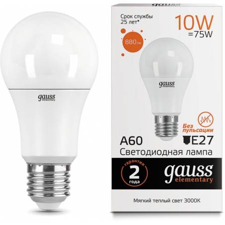 Лампа светодиодная Gauss Elementary A60 10Вт цок.:E27 груша 220B 3000K св.свеч.бел.теп. (упак.:1шт) (23210)