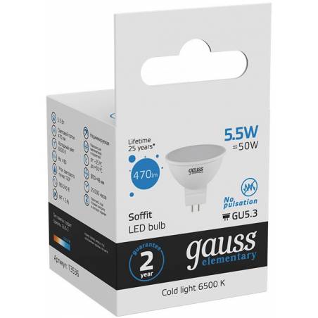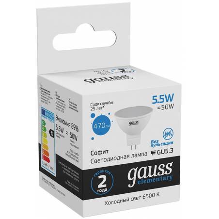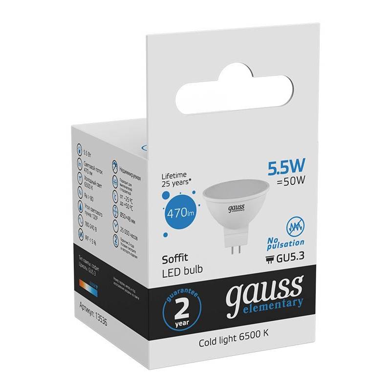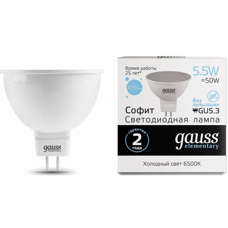 Лампа светодиодная Gauss Elementary MR16 6Вт цок.:GU5.3 спот 220B 6500K св.свеч.бел.хол. MR16 (упак.:10шт) (13536)