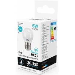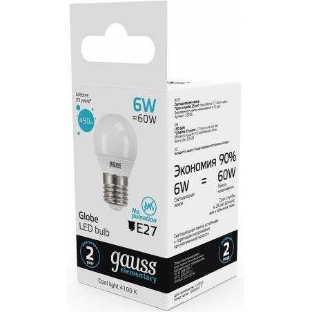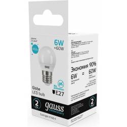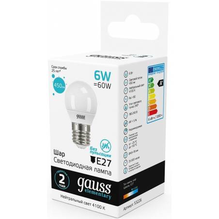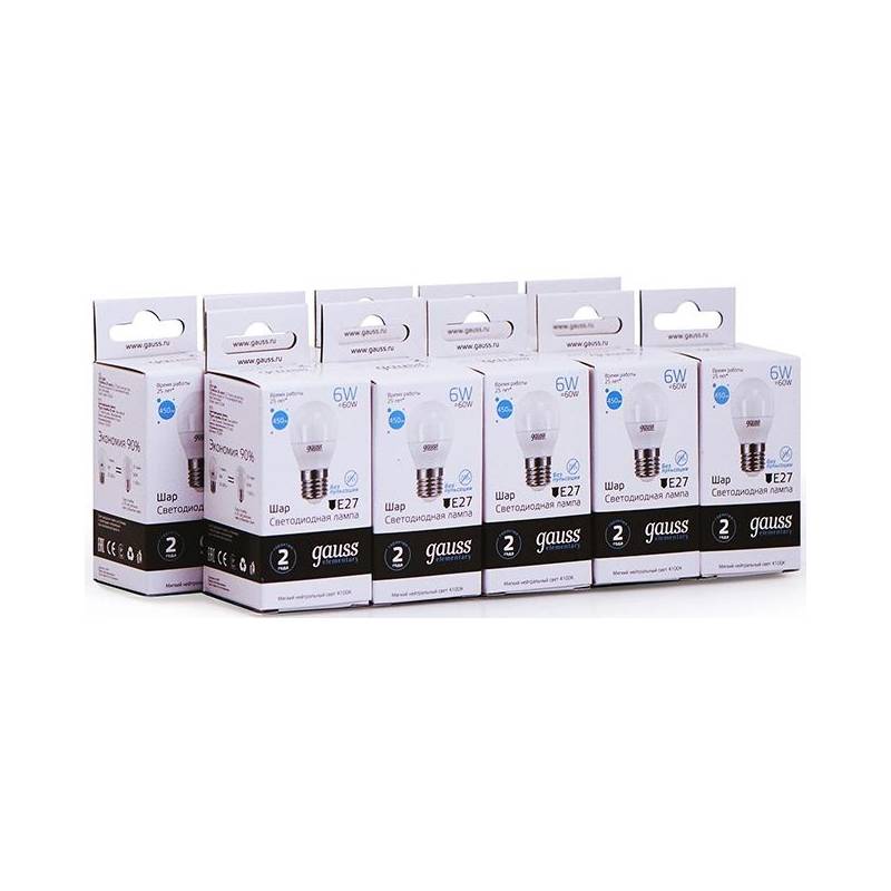 Лампа светодиодная Gauss Elementary 6Вт цок.:E27 шар 220B 4100K св.свеч.бел.нейт. (упак.:10шт) (53226)