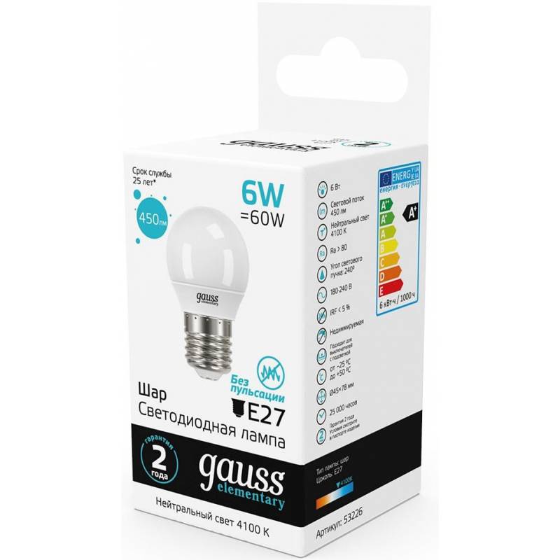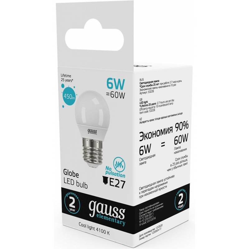 - Светодиодная лампа Gauss - безопасный для здоровья и окружающей среды источник света. Она не пульсирует, мгновенно включается, не содержит ртути и имеет больший срок службы, чем лампы накаливания и КЛЛ, экономичнее ламп накаливания до 10 раз.