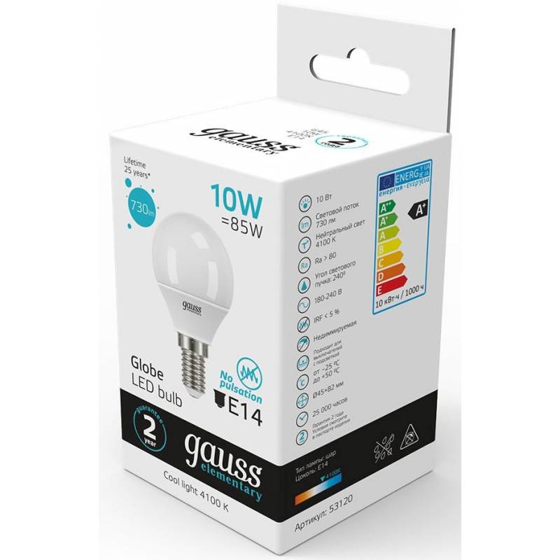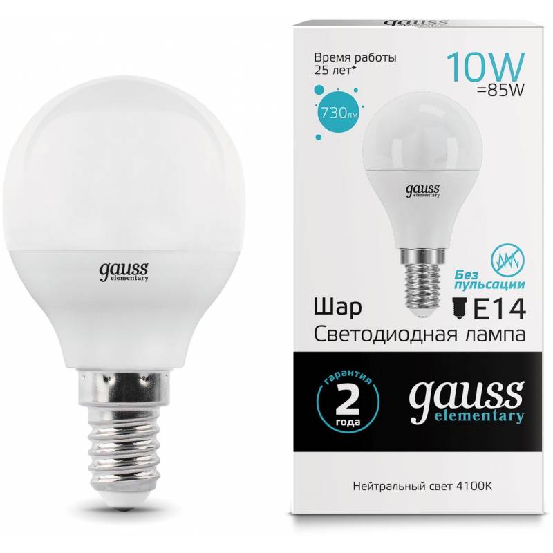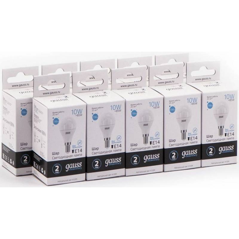 Лампа светодиодная Gauss Elementary 10Вт цок.:E14 шар 220B 4100K св.свеч.бел.нейт. (упак.:10шт) (53120)