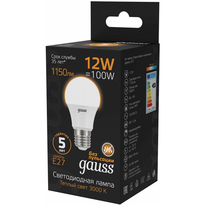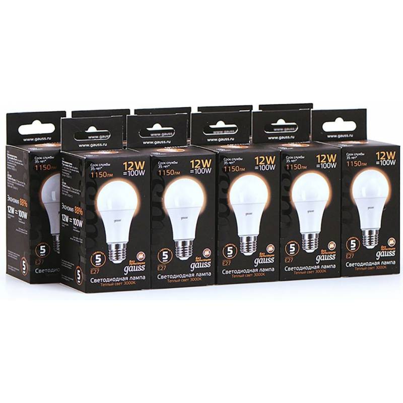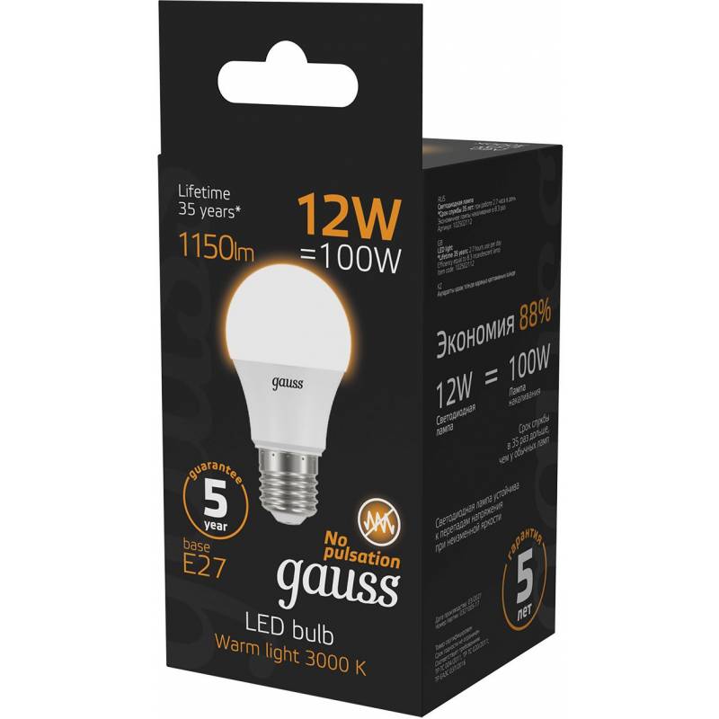 Лампа светодиодная Gauss A60 12Вт цок.:E27 шар 220B 3000K св.свеч.бел.теп. A60 (упак.:10шт) (102502112)