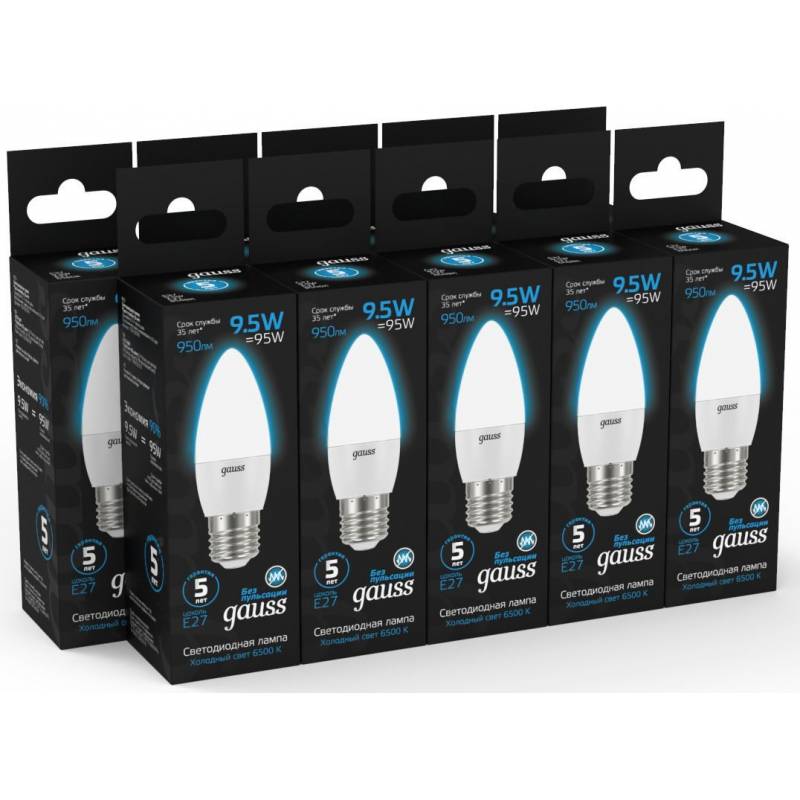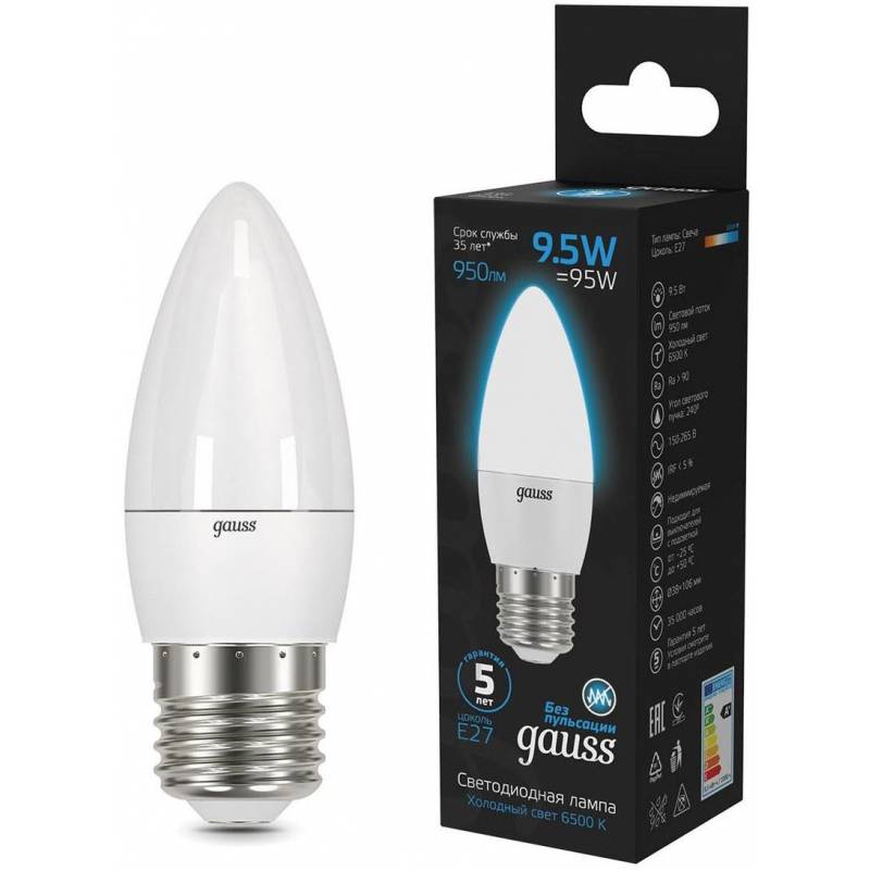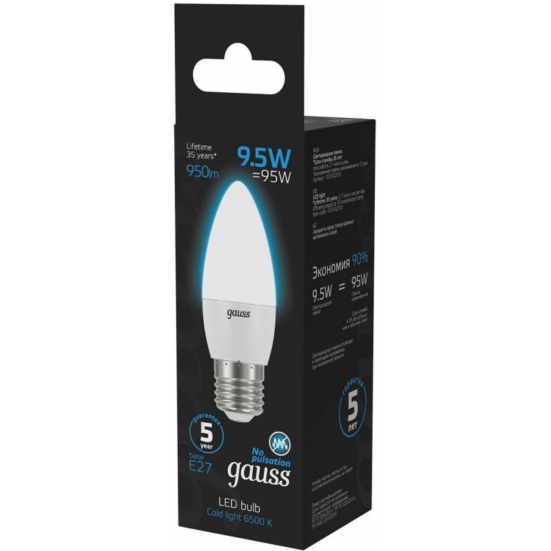 Лампа светодиодная Gauss 103102310 9.5Вт цок.:E27 свеча 220B 6500K св.свеч.бел.хол. (упак.:10шт)
