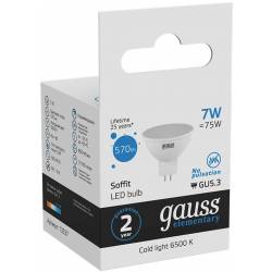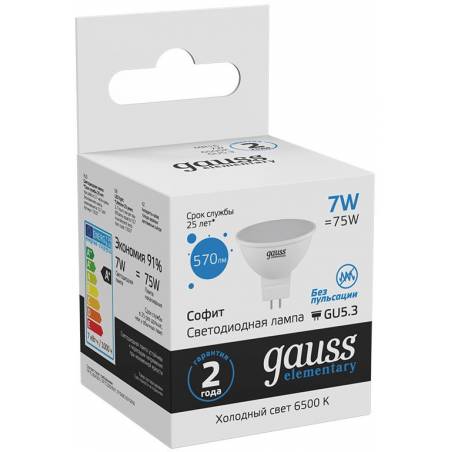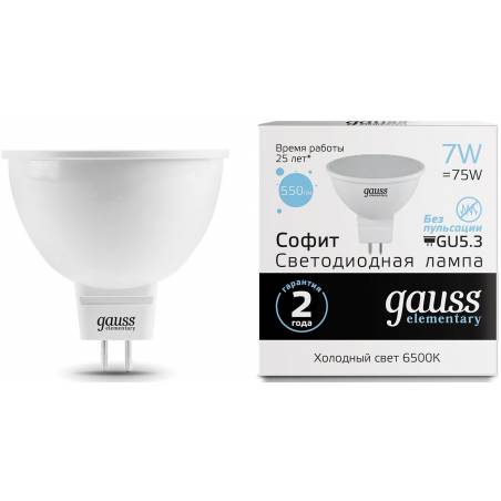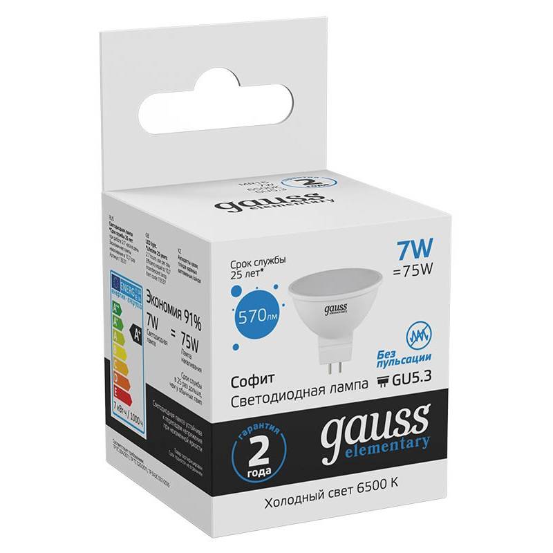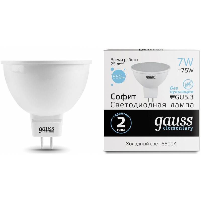 Лампа светодиодная Gauss Elementary MR16 7Вт цок.:GU5.3 спот 220B 6500K св.свеч.бел.хол. MR16 (упак.:10шт) (13537)