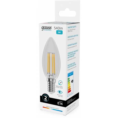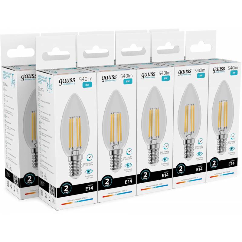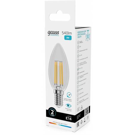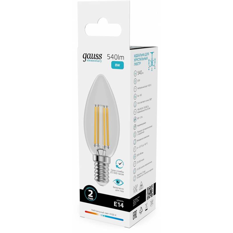 Лампа филам. Gauss Filament 8Вт цок.:E14 свеча 220B св.свеч.бел.нейт. (упак.:10шт) (32128)