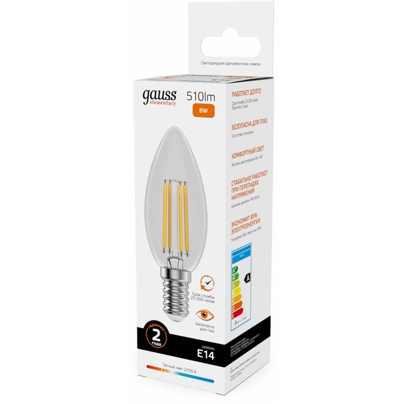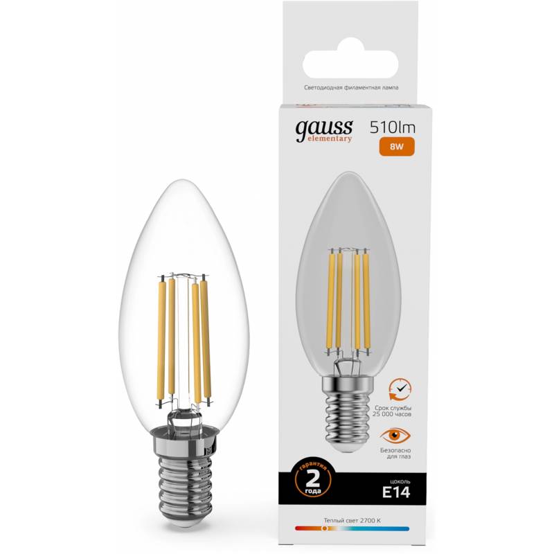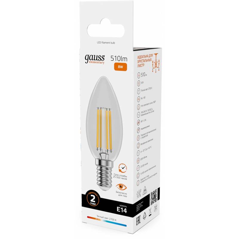 Лампа филам. Gauss Filament 8Вт цок.:E14 свеча 220B св.свеч.бел.теп. (упак.:10шт) (32118)