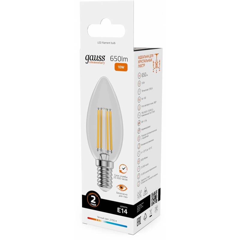 Лампа филам. Gauss Filament 10Вт цок.:E14 свеча 220B св.свеч.бел.теп. (упак.:10шт) (32110)