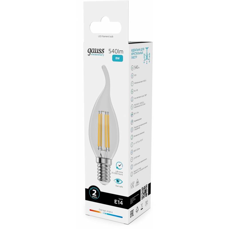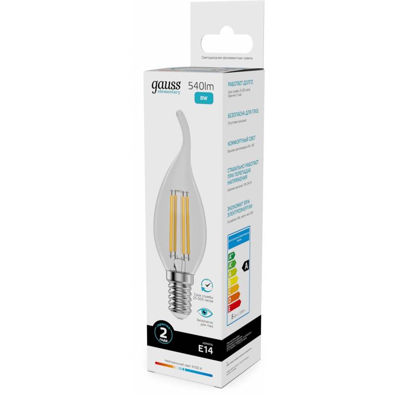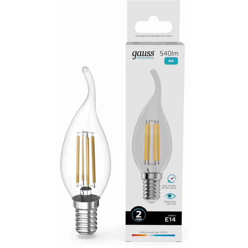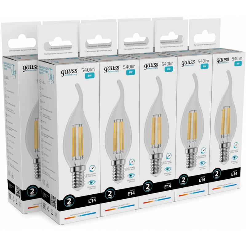 Лампа филам. Gauss Filament 8Вт цок.:E14 свеча 220B св.свеч.бел.нейт. (упак.:10шт) (42128)