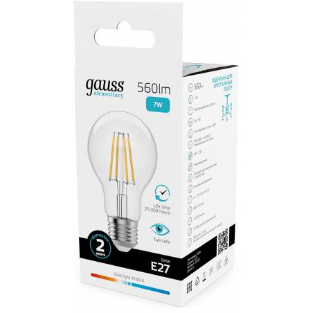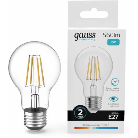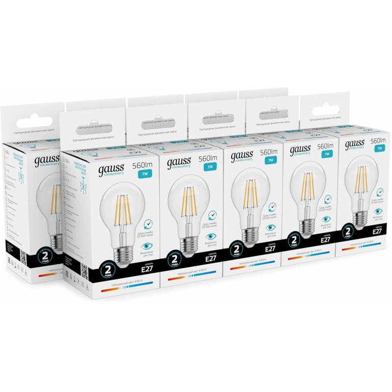 Лампа филам. Gauss Filament 7Вт цок.:E27 груша 220B св.свеч.бел.нейт. (упак.:10шт) (22227)
