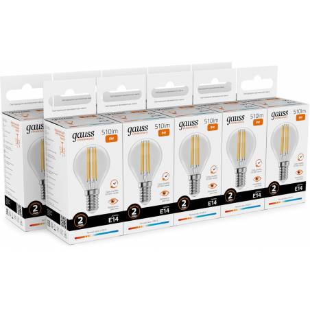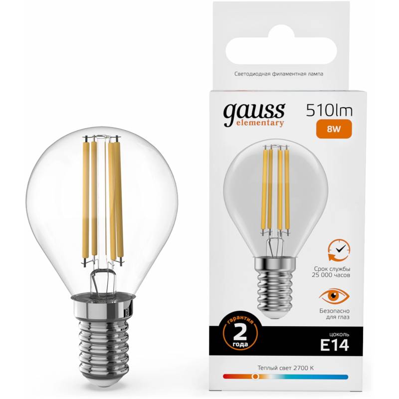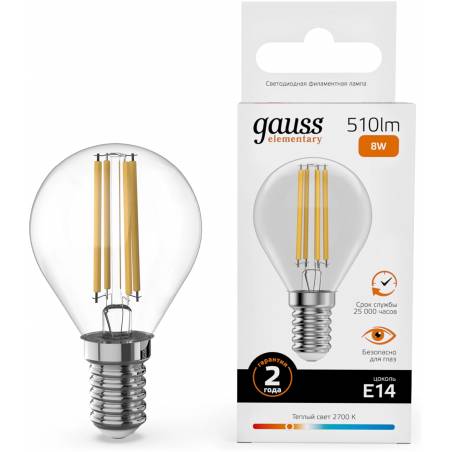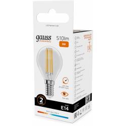 Лампа филам. Gauss Filament 8Вт цок.:E14 шар 220B св.свеч.бел.теп. (упак.:10шт) (52118)
