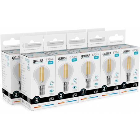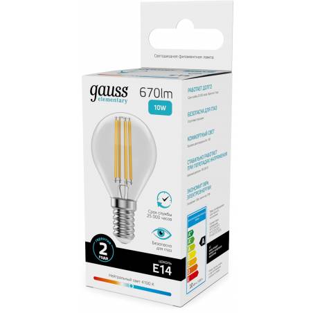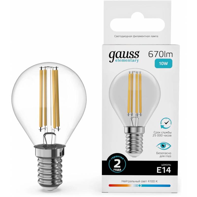 Лампа филам. Gauss Filament 10Вт цок.:E14 шар 220B св.свеч.бел.нейт. (упак.:10шт) (52120)