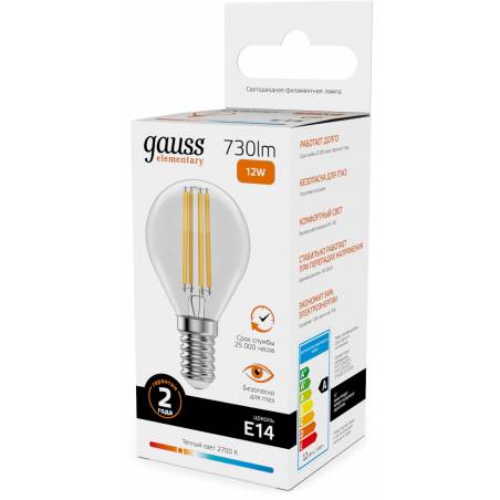 Лампа филам. Gauss Filament 12Вт цок.:E14 шар 220B св.свеч.бел.теп. (упак.:10шт) (52112)
