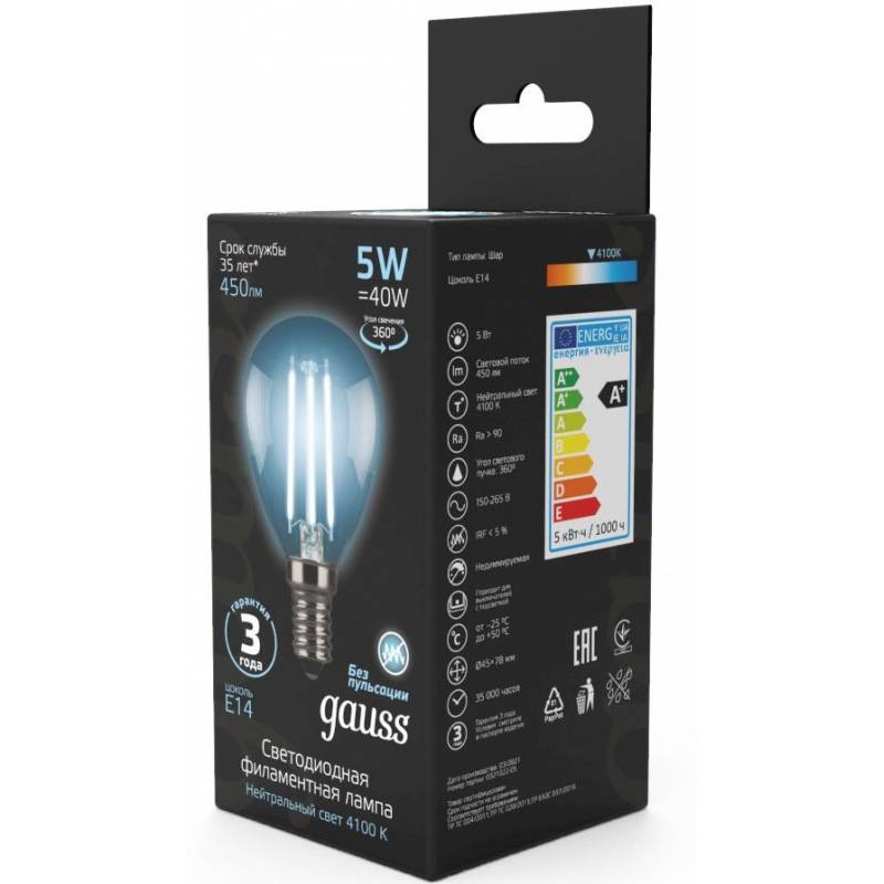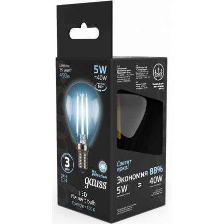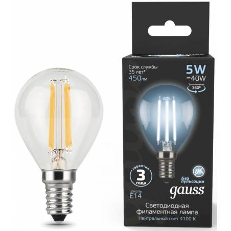 Лампа филам. Gauss Filament 5Вт цок.:E14 свеча 220B 4100K св.свеч.бел.нейт. (упак.:1шт) (105801205)