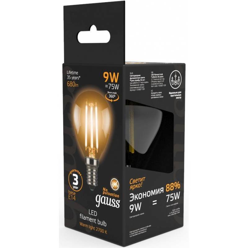 Лампа филам. Gauss Filament 9Вт цок.:E14 шар 220B 2700K св.свеч.бел.теп. (упак.:10шт) (105801109)