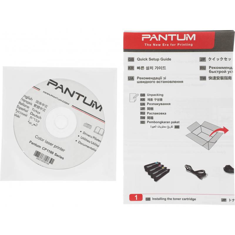 - Лазерный принтер, стартовый картридж (CTL-1100K: 1000 страниц (черный); CTL-1100C: 700 страниц (голубой); CTL-1100M: 700 страниц (пурпурный); CTL-1100Y: 700 страниц (желтый), краткое руководство по установке, USB кабель для подключения к к