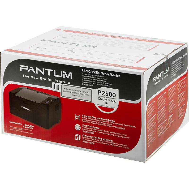 - Принтер P2500.Стартовый картридж PC-210E (700 страниц, перезаправляемый).Краткое руководство по установке.Шнур питания.USB кабель для подключения к компьютеру.Гарантийный талон.