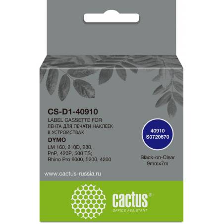 Картридж ленточный Cactus CS-D1-40910 40910 черный на прозрачном 9x7 для Dymo LM 160, 210D, 280, PnP, 420P, 500 TS Rhino Pro 60