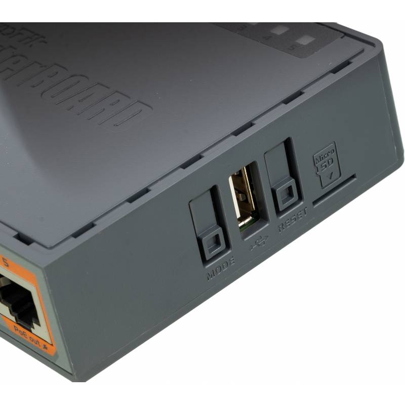 - 5x Gigabit Ethernet, SFP, Dual Core 880MHz CPU, 256MB RAM, USB, microSD, RouterOS L4, IPsec hardware encryption support and The Dude server package