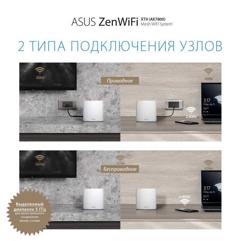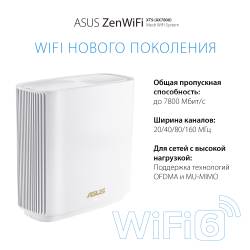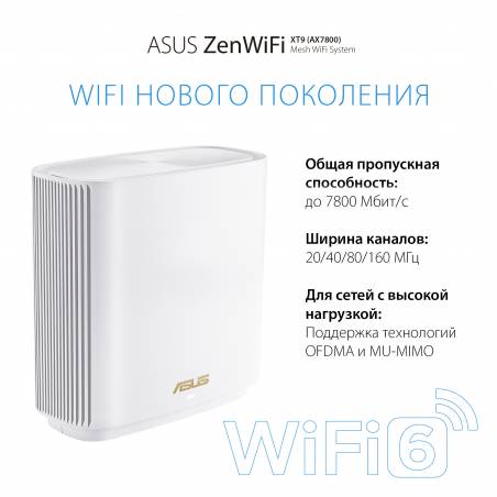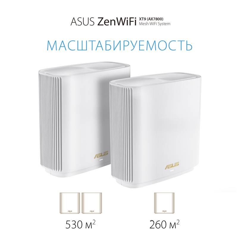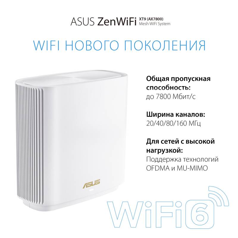 - Беспроводная ячеистая система ZenWiFi XT9 состоит из пары трехдиапазонных маршрутизаторов ASUS стандарта Wi-Fi 6 (AX7800). Она предназначена для развертывания скоростной, надежной и защищенной сети Wi-Fi в помещениях большого размера.