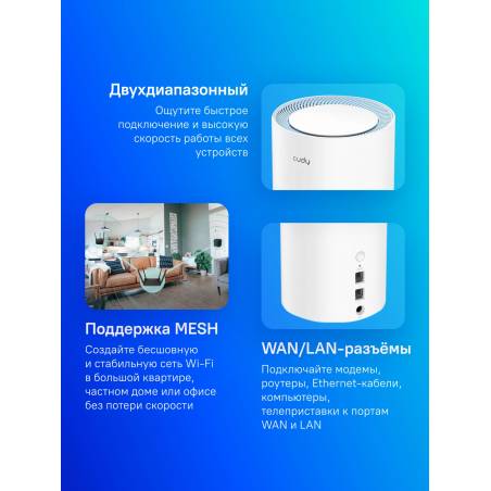 - Роутер Wi-Fi Mesh АС1200 - 2 шт., сетевой адаптер питания от 220В (АС), RJ45 Ethernet-кабель, краткое руководство по установке.