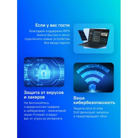 - DHCP-сервер, Dynamic DNS (DDNS), MESH, UPnP, VPN, Wake-on-LAN, WPS, протокол IPv6