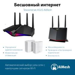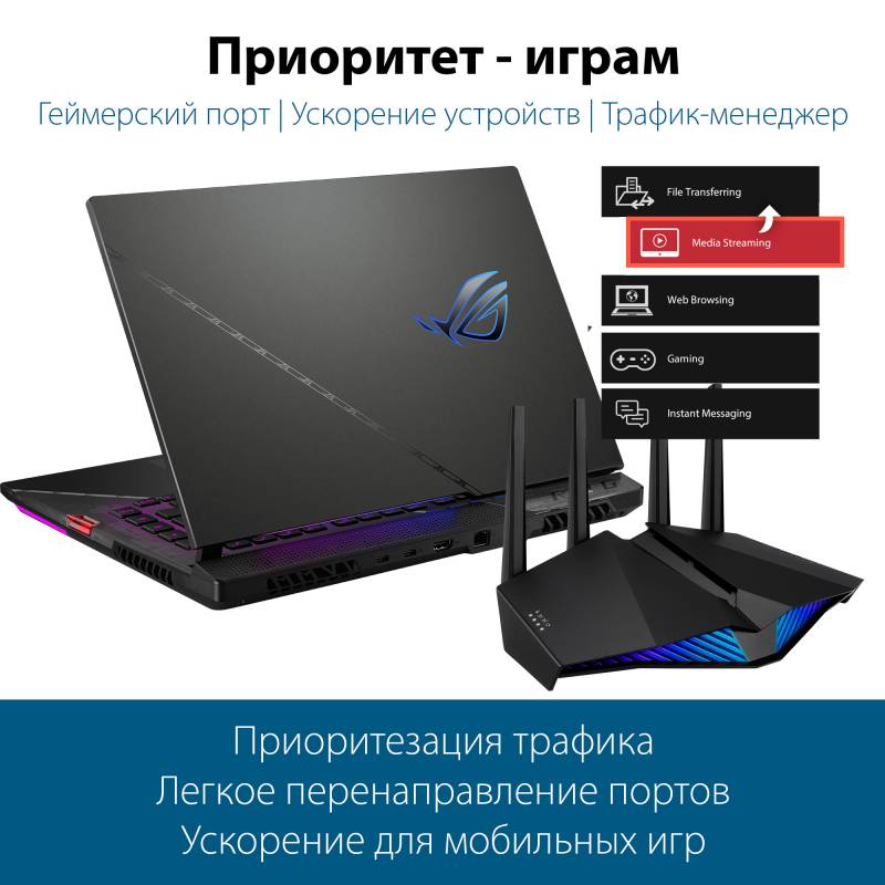- Двухдиапазонный игровой маршрутизатор формата AX5400: Wi-Fi 6 (802.11ax), режим мобильного гейминга, подсветка Aura, система информационной безопасности, технология AiMesh, функция Gear Accelerator, геймерский порт, трафик-менеджер Adaptive OoS, перен