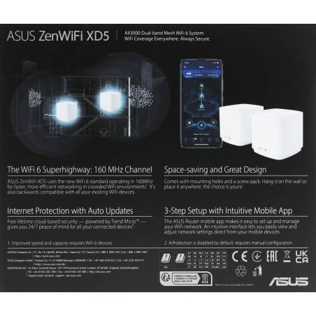 - Система ZenWiFi XD5 состоит из трех маршрутизаторов ASUS AX3000 WiFi 6 с уникальными технологиями, которые обеспечивают сверхбыстрое, надежное и безопасное соединение Wi-Fi — как дома, так и за его пределами!