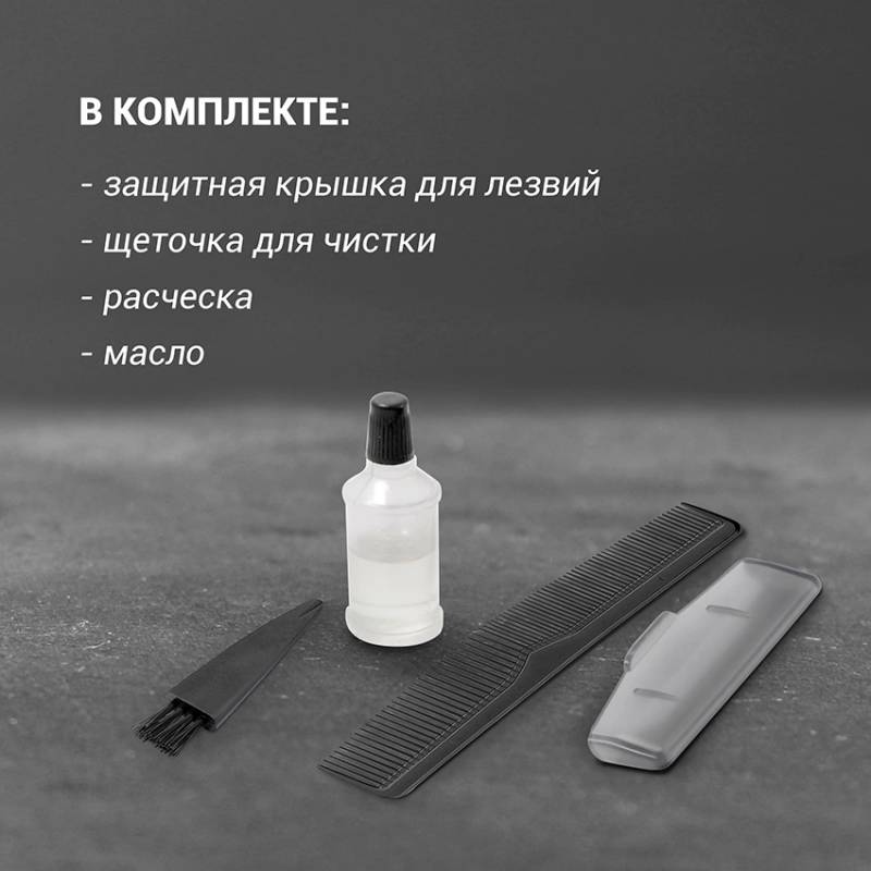 - защитная крышка для режущих лезвий, масло, парикмахерская расческа, щетка для чистки машинки