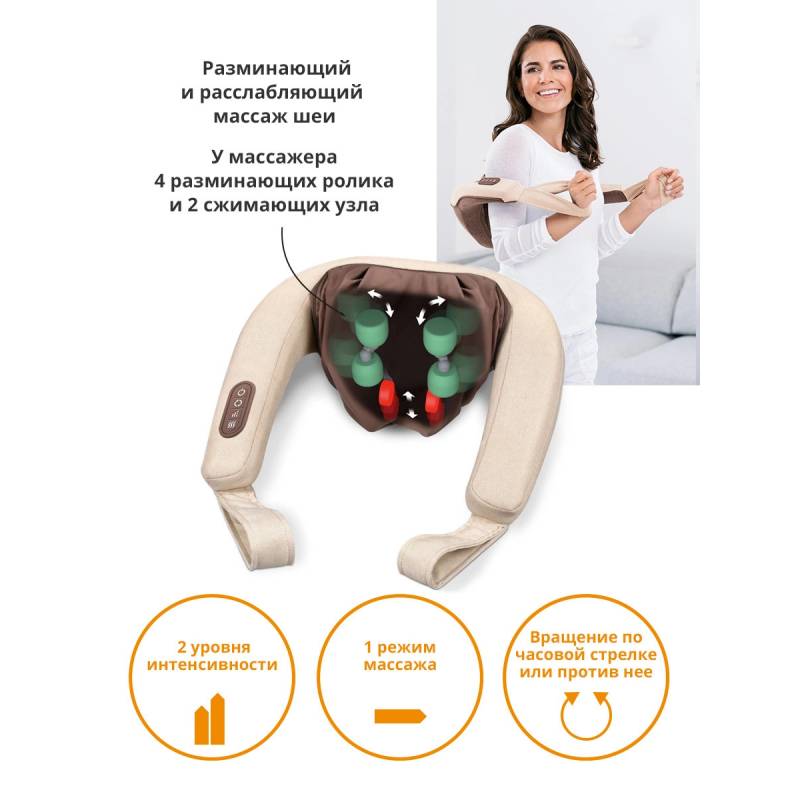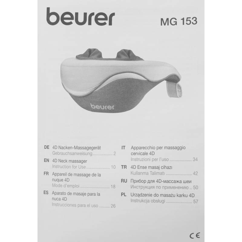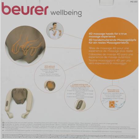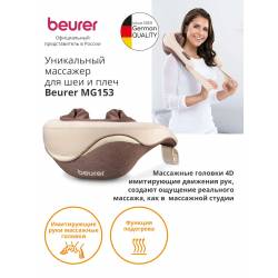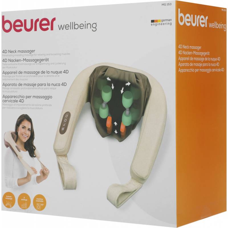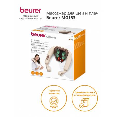 - Благодаря прибору для массажа шеи Beurer MG 153 Вы приобретаете собственную массажную студию на дому. Имитирующие руки массажные головки 4D создают ощущение реального массажа. Функция успокаивающего тепла может быть включена в качестве опции. Благотворное