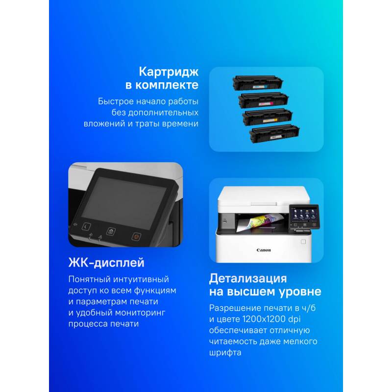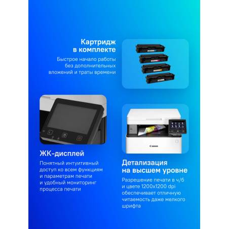 - В комплект поставки принтера входят стартовые картриджи: черный — 1350 стр., (C/M/Y) — 680 стр