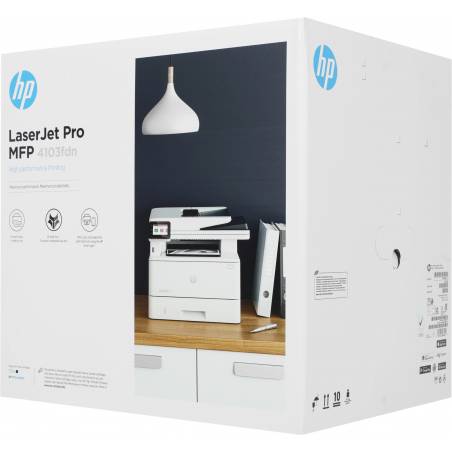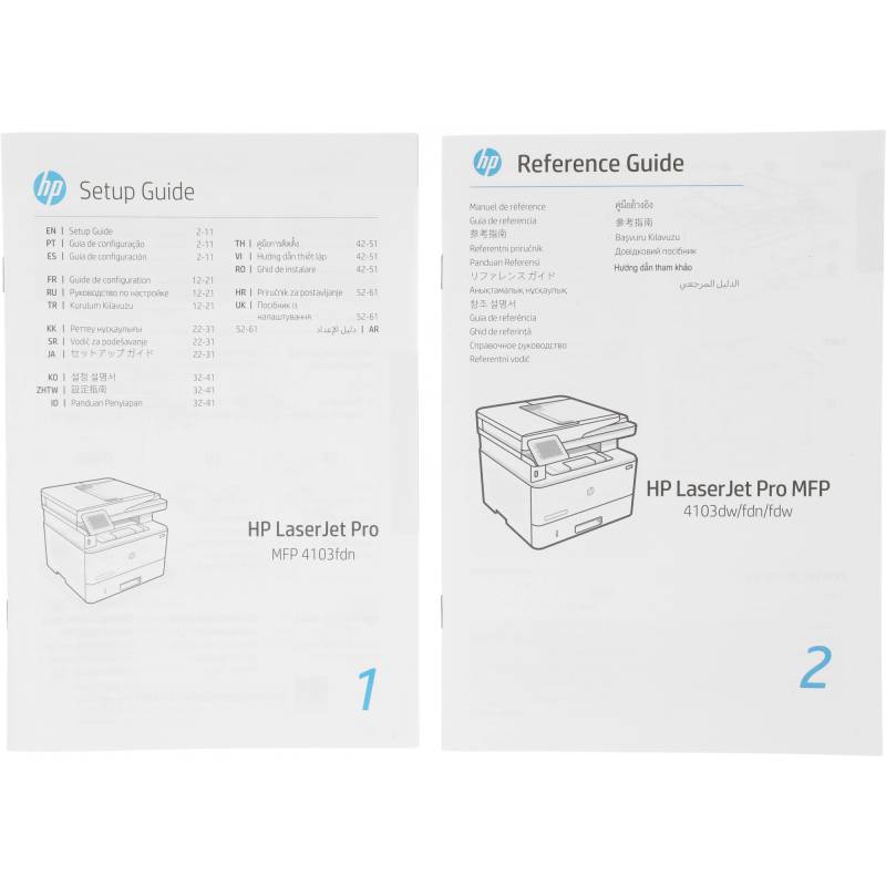 - МФУ HP LaserJet Pro 4103fdn; предустановленный оригинальный лазерный картридж для HP LaserJet, черный (3050 страниц); руководство по началуработы; листовка с информацией о поддержке; руководство по гарантии; листовка с нормативными требованиями; кабель пи